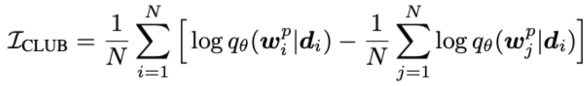 이 추정자는 이름에서도 알 수 있듯이 MI의 상한값을 계산한다. 따라서 이 CLUB은 MI를 최소화하는 데 사용된다. MI의 상한값은 변수 $y$의 $x$에 대한 조건부 확률을 이용하여 계산한다. 하지만 우리에게는 한 배치(batch)의 샘플 쌍 ${(x_i, y_i)}_{i=1}^N$만이 주어지기 때문에 정확한 조건부 확률을 구할 수 없다. 따라서 우리는 변분추론(Variational approximation) 값인 $q_\theta(y|x)$를 이용한다.