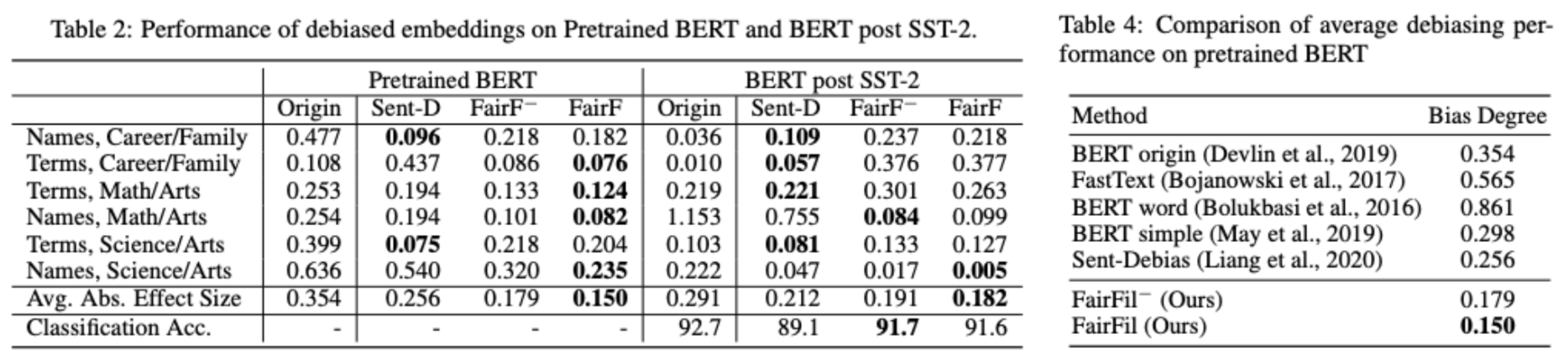 Pretrained 인코더에서 나온 문장 임베딩의 편향을 개선하는 Fair Filter (FairFil) network를 제안
